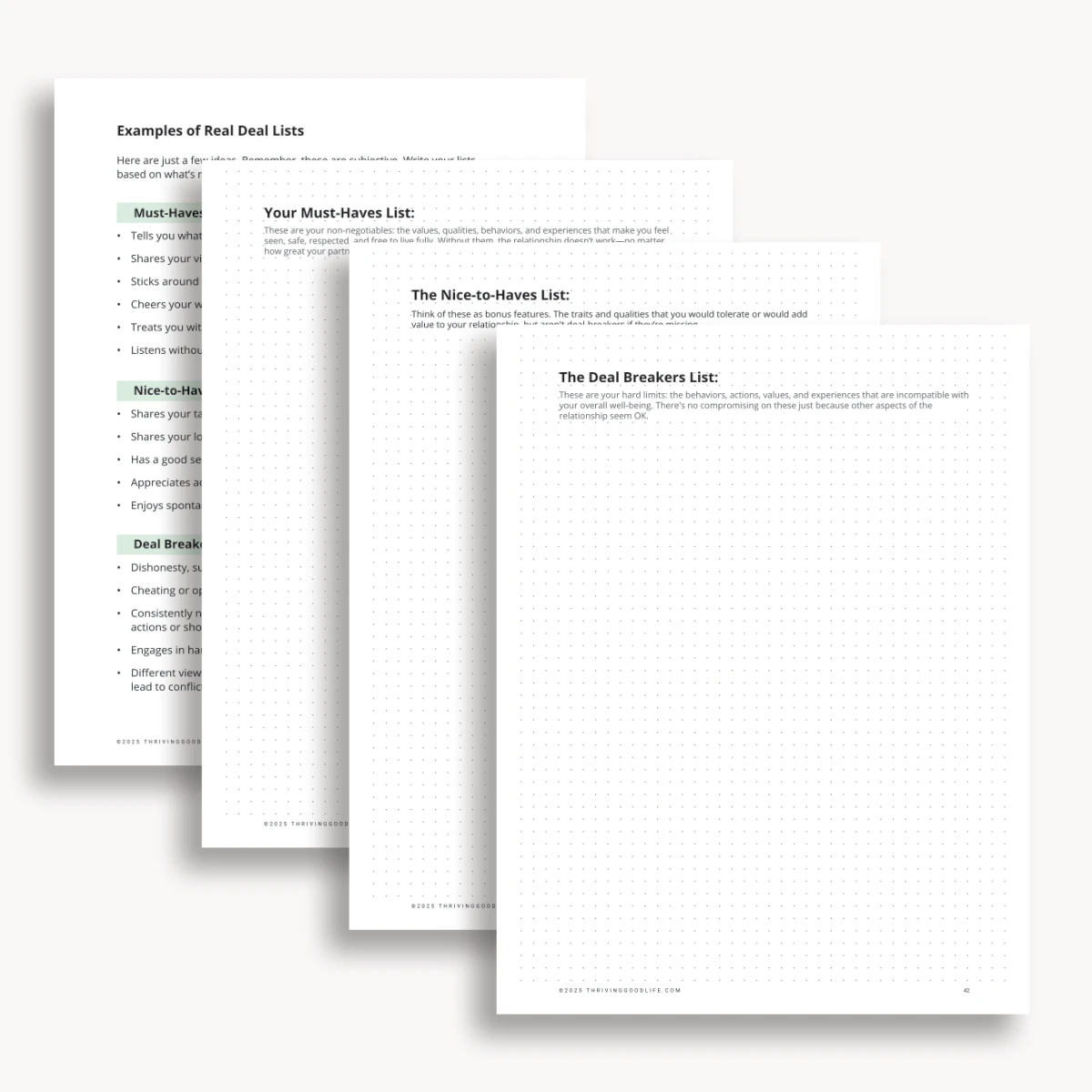 This workbook walks you through a structured relationship system from spotting patterns to building realistic must-have lists to setting boundaries that stick, and more.